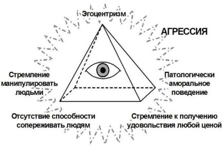 Учёные, как обычно, исследовали не причину, а следствие - отличия в функционировании различных областей мозга психопатов. Но в данном случае главное не это, а то, что в результате данного исследования учёные установили характеристики, по которым можно точно распознать психопатов и маньяков. Эти характеристики, чтобы легче было понять, можно проиллюстрировать на рисунке. Если в центре рисунка изобразить в виде символа глаза взгляд ни мир отделившего себя от людей и зацикленного на своей идее эгоцентриста-маньяка, то присущие ему черты можно расположить вокруг него в вершинах пирамиды так, как это показано на следующем рисунке.
